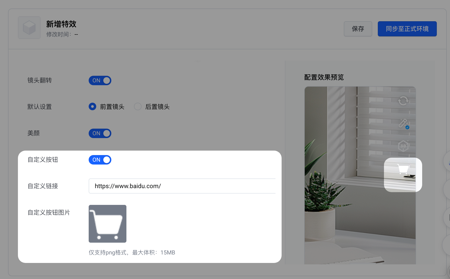 自定义按钮开关打开后,在体验页菜单将出现配置的“自定义按钮图片”,用户点击后将跳转至配置的“自定义链接” 该功能可以用于配置试穿试戴商品链接,用户体验后能够跳转到购买页面,缩短交易链路,帮助提升转化