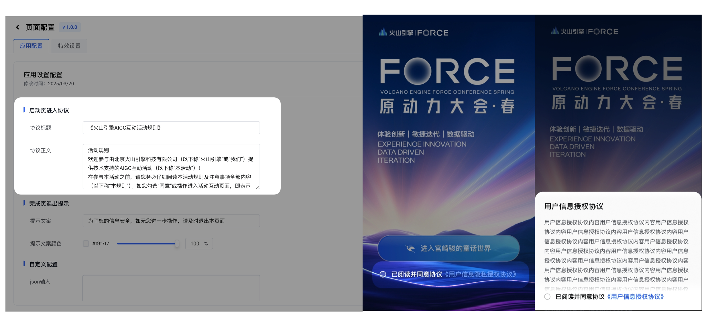 因特效体验需要打开摄像头拍摄,启动页底部建议提示用户阅读并了解后,再进入特效体验。 所有特效将共享同一份协议配置