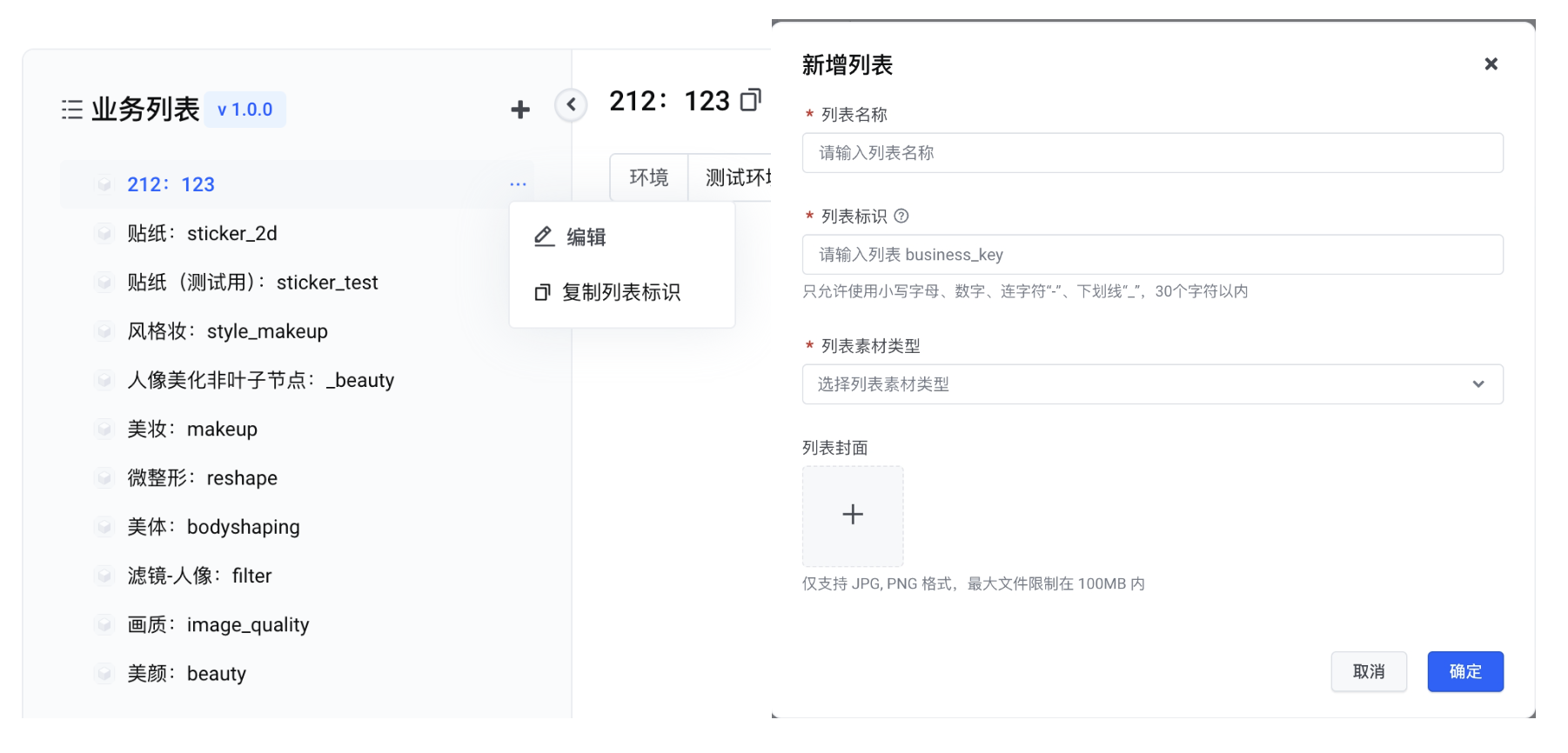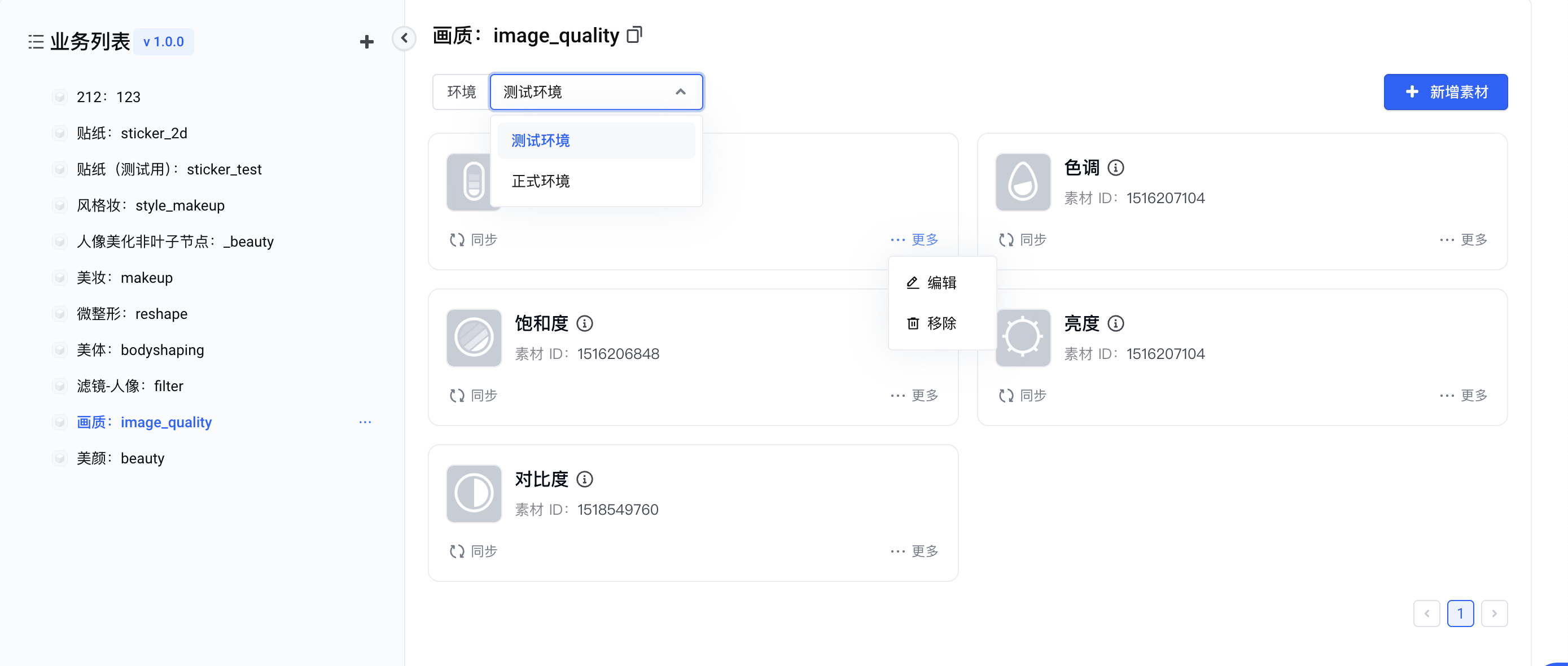 环境: 测试环境: 可以新增、编辑、移除素材,以及同步素材至正式环境 正式环境:不能编辑,只能移除