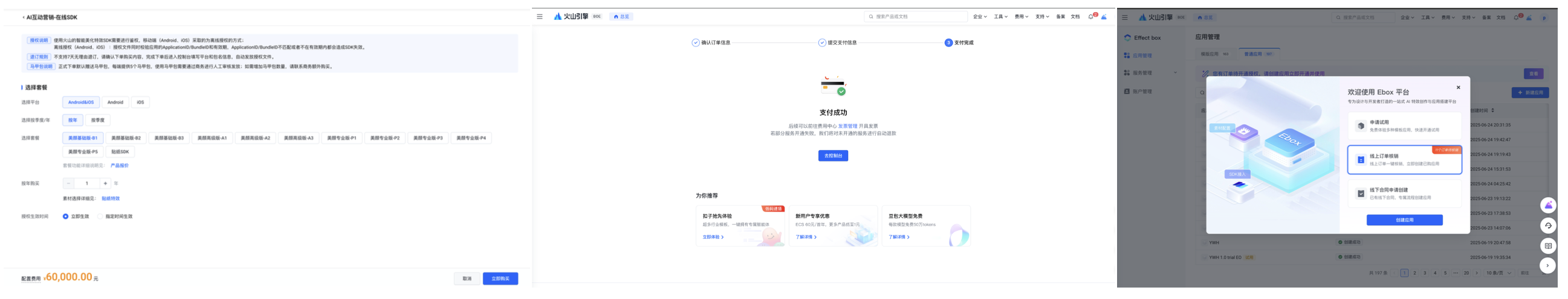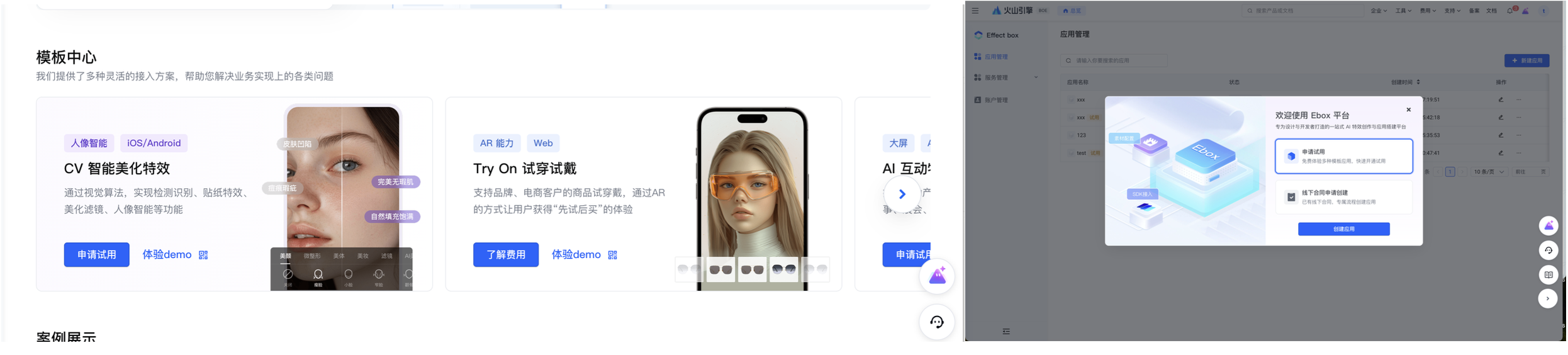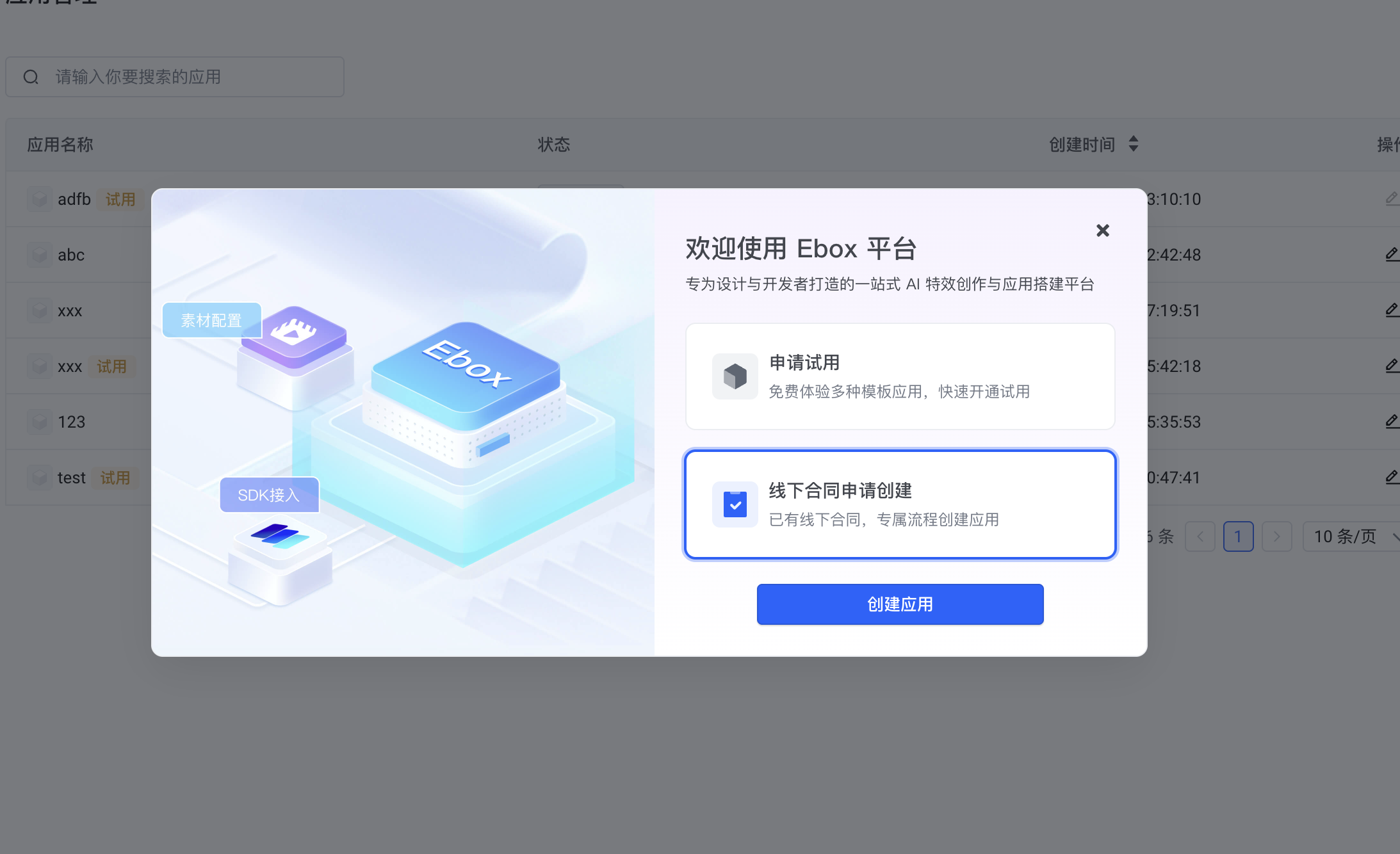 申请试用: 需要完成企业认证,每个租户每个应用有一次试用机会,试用后不能重复申请