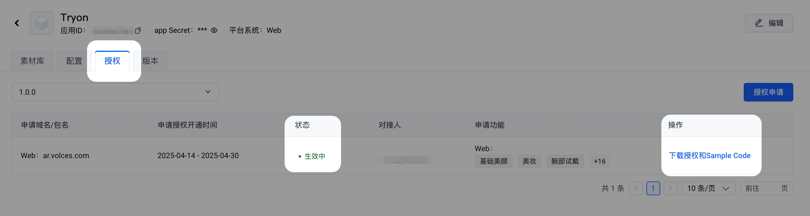 在「授权」tab查看应用授权 下载Sample code集成到您的应用 了解更多Web AR SDK能力与接入指南:请查阅