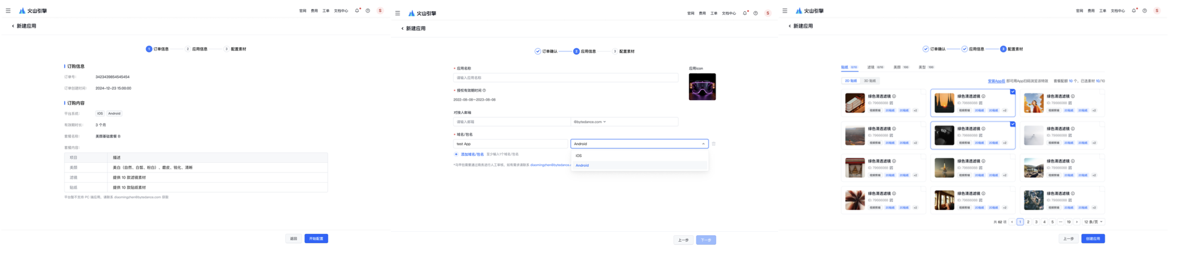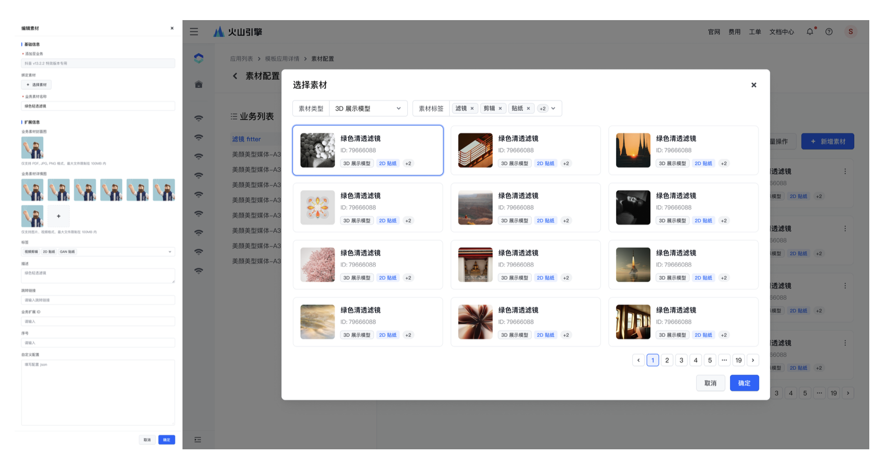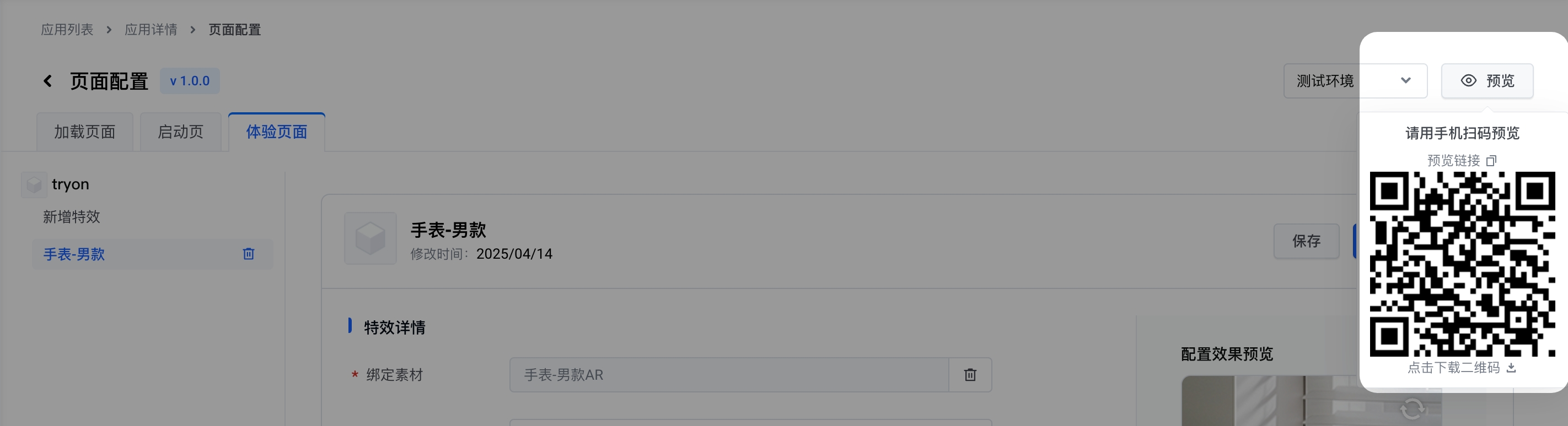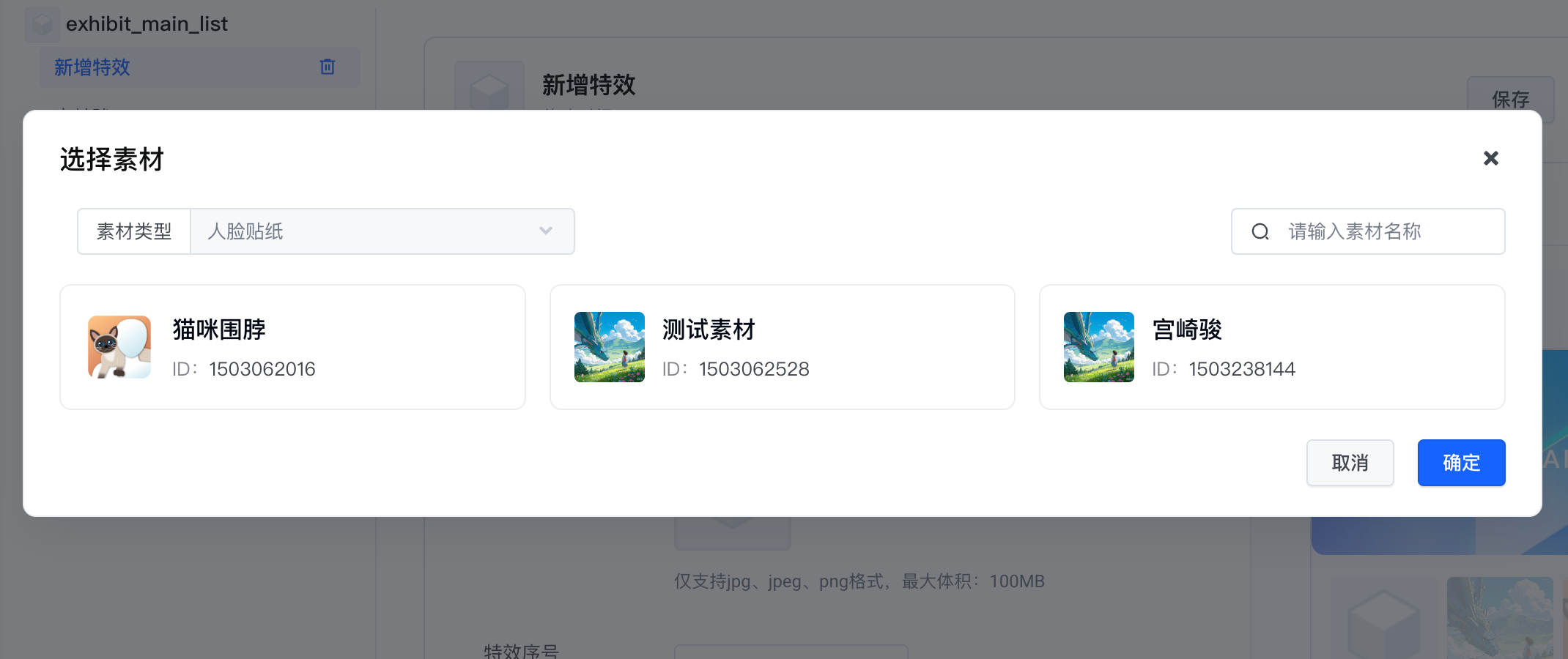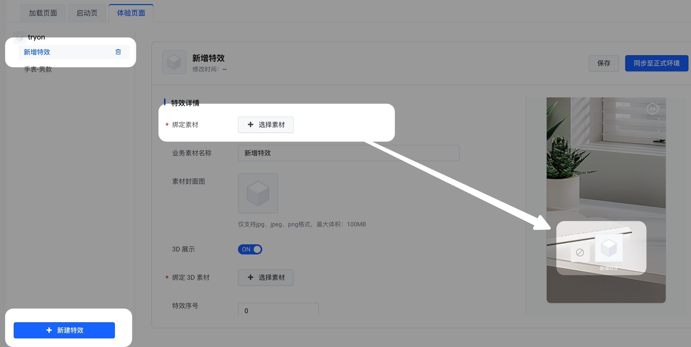 可以添加多个特效,新建后出现在左侧特效列表 在体验页,用户可以从底部托盘选择特效进行体验 绑定素材:从应用素材库选择素材包