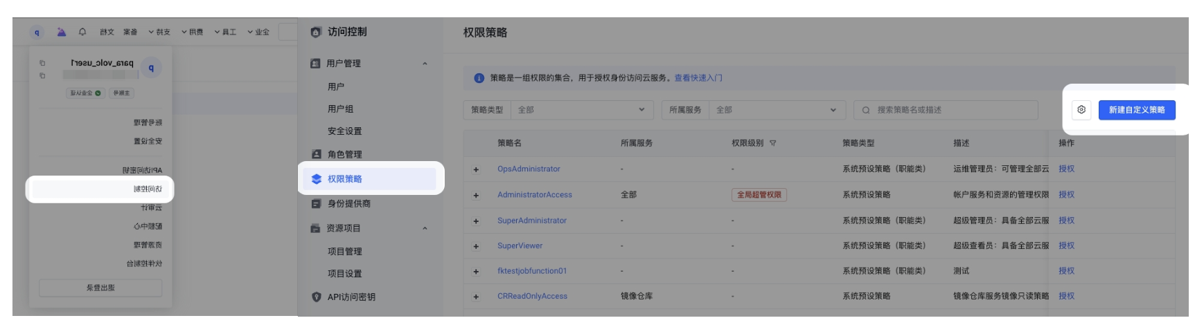 进入访问控制 - 权限策略 - 新建自定义策略https://console.volcengine.com/iam/policymanage 选择「JSON编辑器」 ListUsers { "Statement": [ { "Effect": "Allow", "Action": [ "iam:ListUsers" ], "Resource": [ "*" ] } ] }