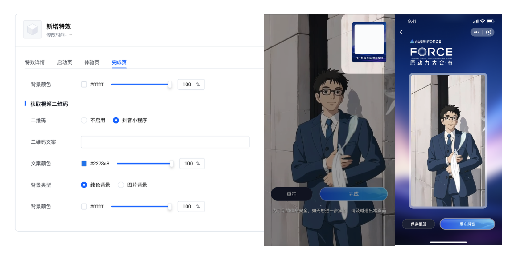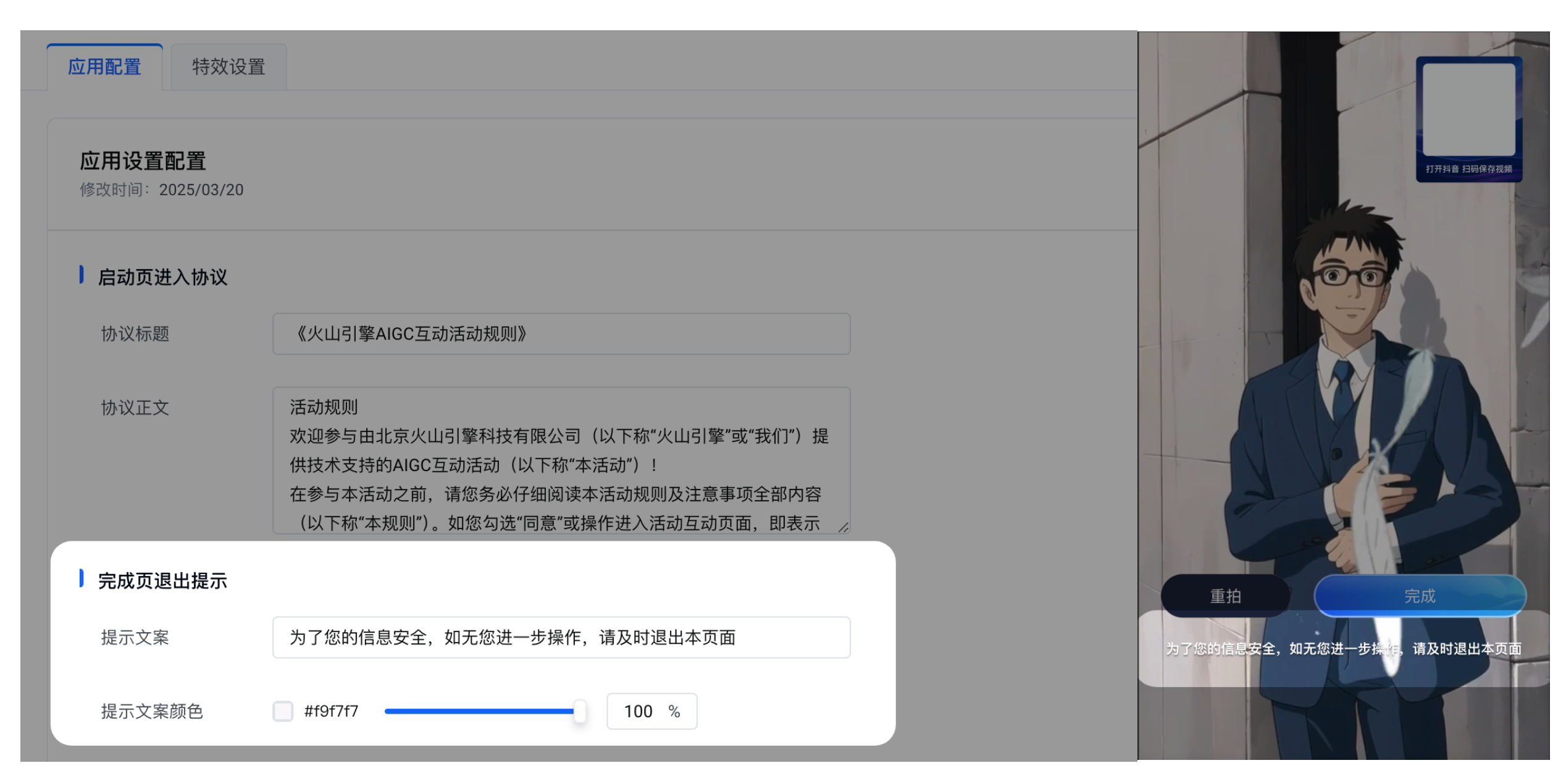 因用户在特效体验过程中,人像将出现在大屏,完成页底部建议提示用户在结束体验后及时退出,保护隐私安全。 所有特效将共享同一份退出提示配置