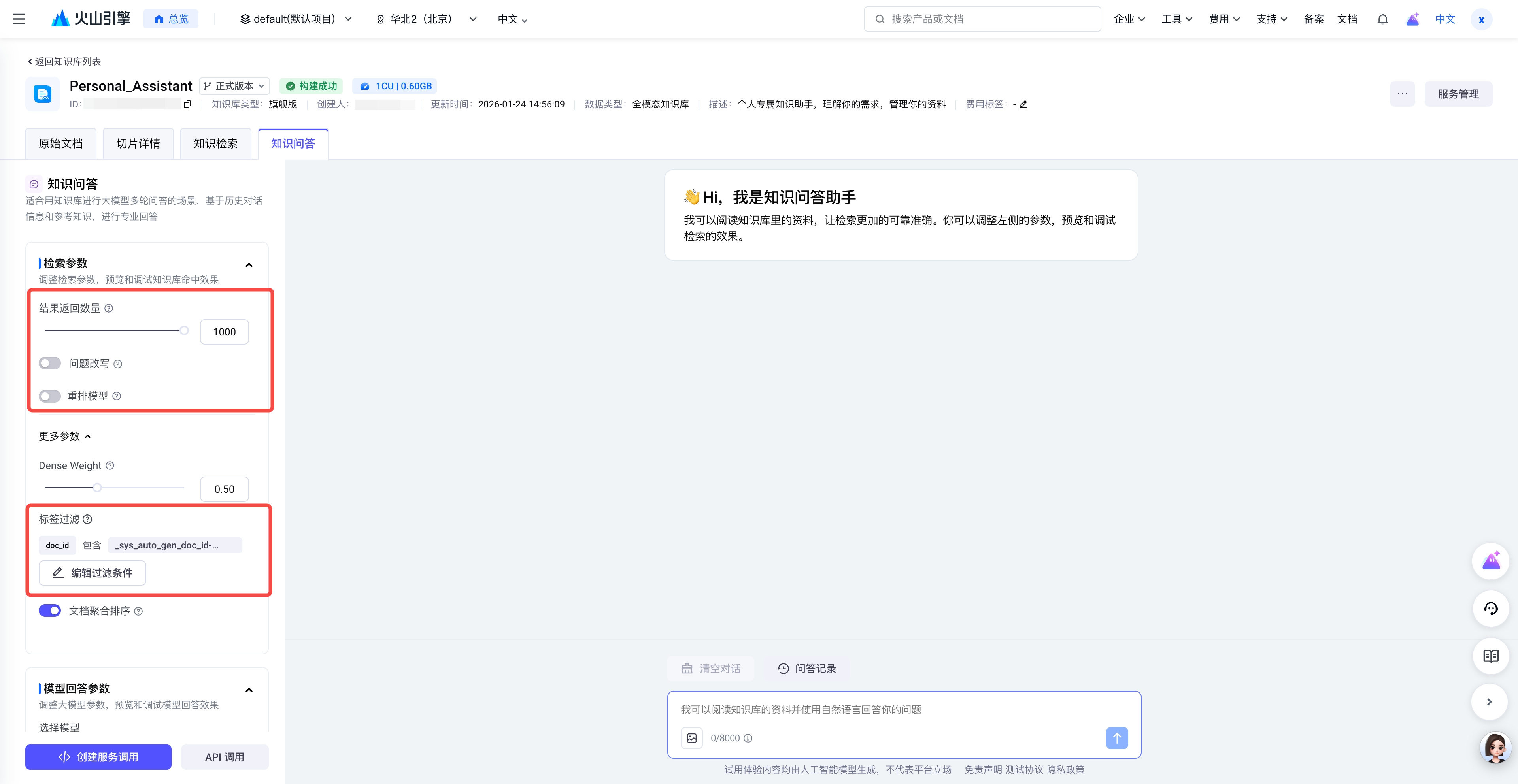 标签写入成功后,可在列表页查看已配置的标签值;进行知识检索/问答时,支持基于标签编辑过滤条件实现精准检索与问答。
