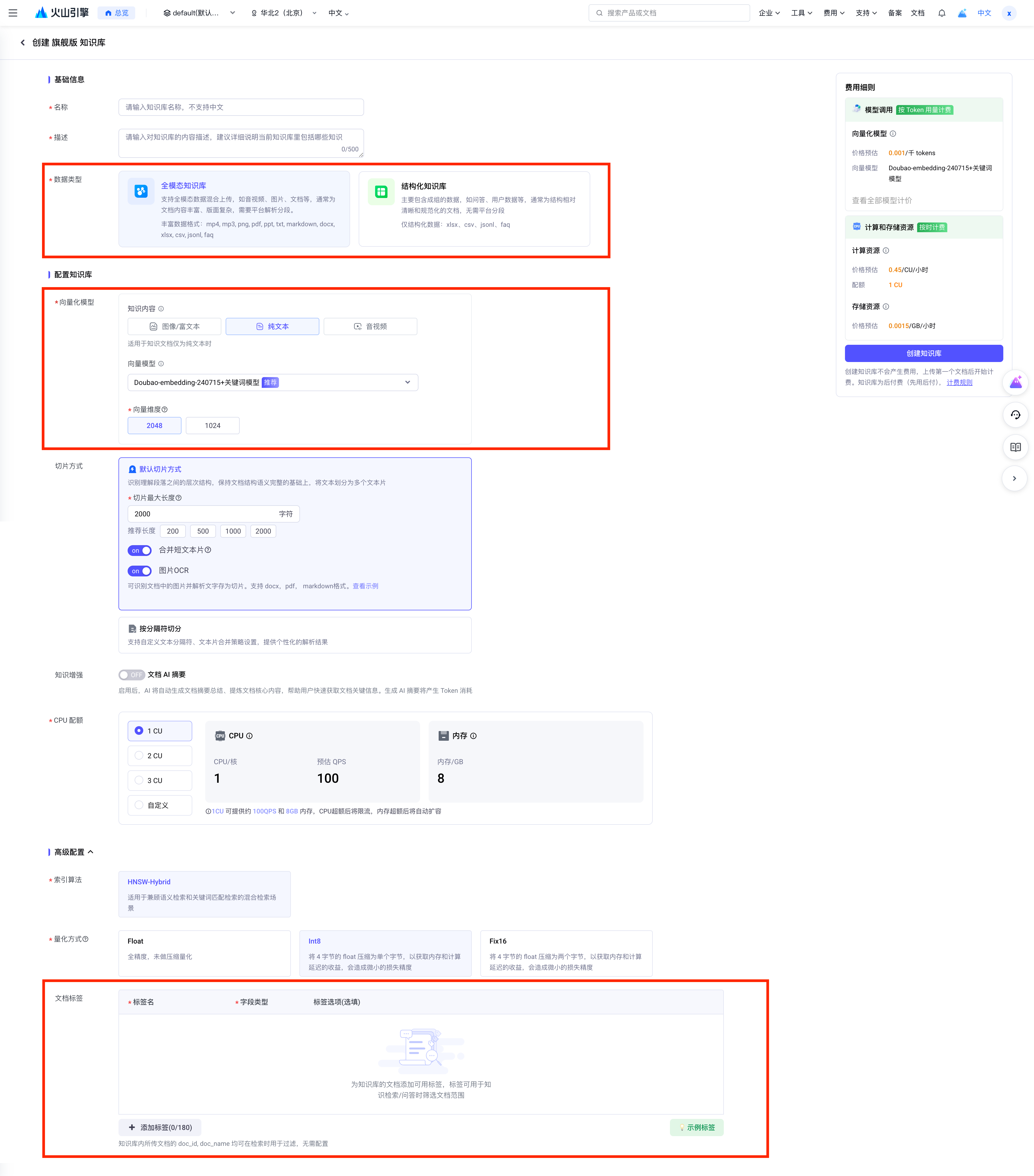 创建【旗舰版】知识库,并根据业务场景选择合适的【数据类型】和【知识内容】类型。在【高级配置】中,可预先定义文档标签字段,包括标签名称、字段类型以及可选的标签选项,这些字段将作为自动打标的目标输出字段。
