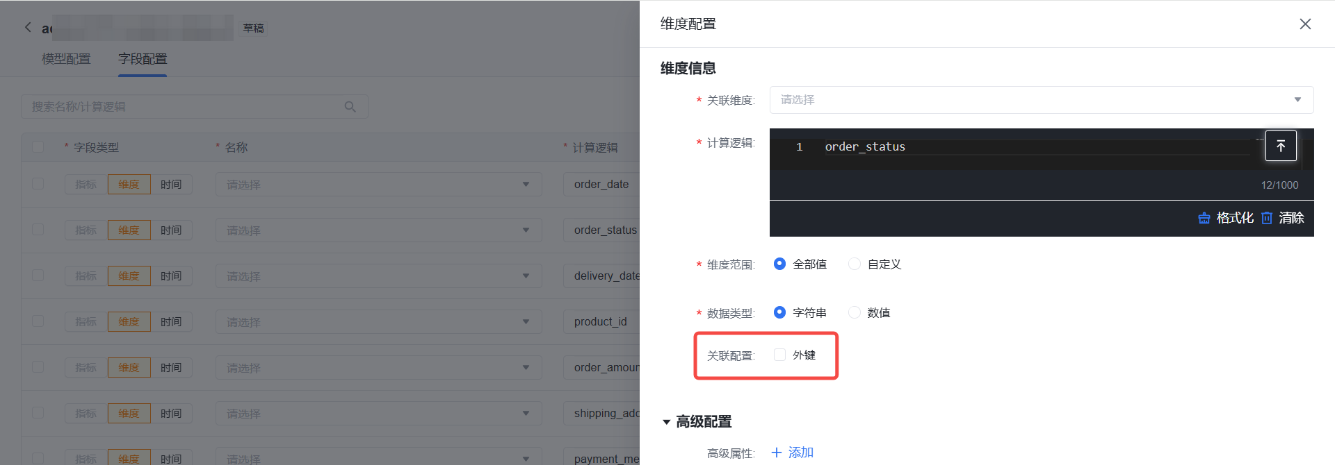 当选择的模型类型支持维度建模自动关联时,将会展示相应配置信息。