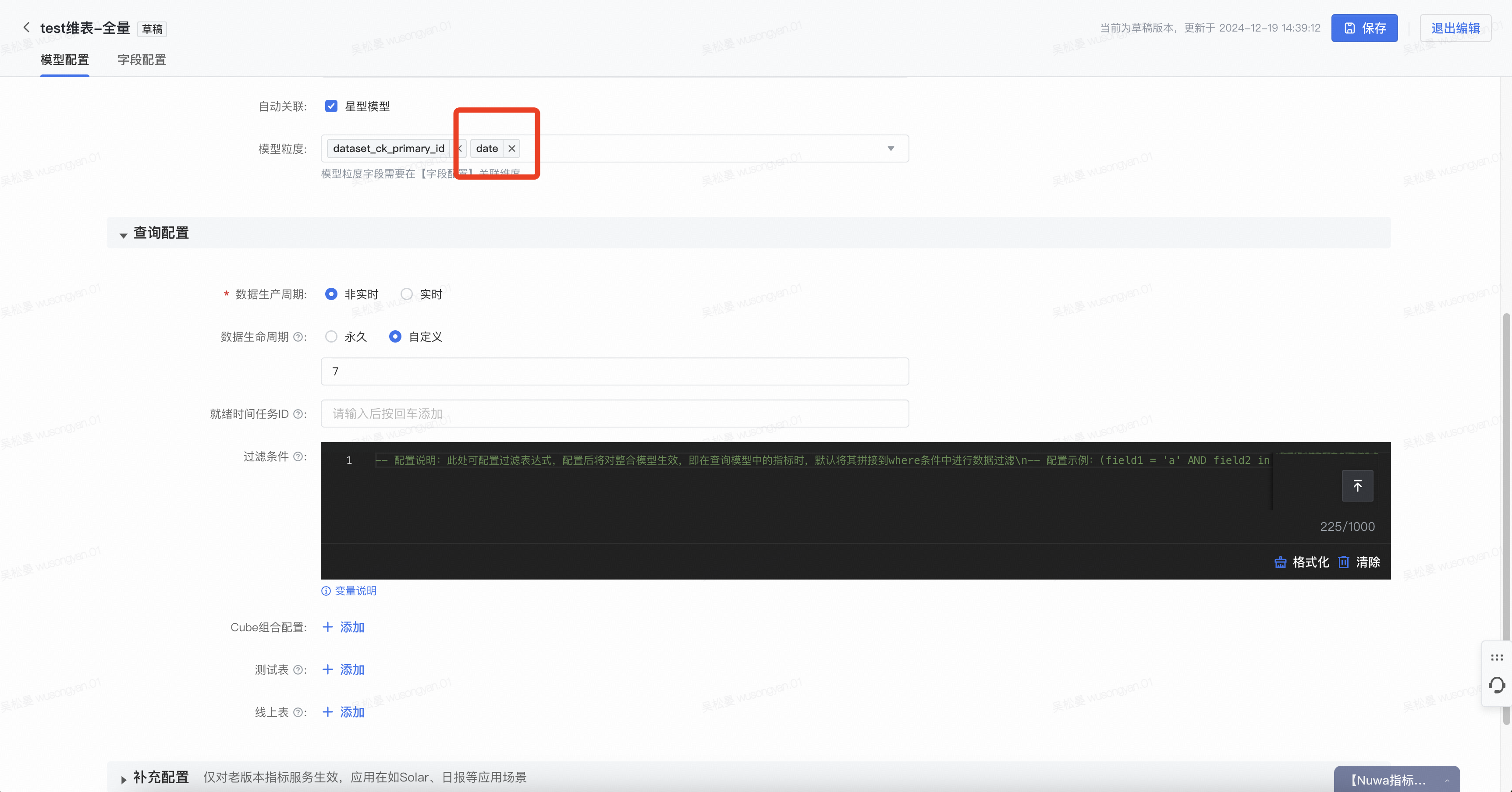 例如:假设维表按日全量快照,时间(分区)字段为p_date,关联事实时要查询最新快照时,配置模型过滤条件为p_date='${last_date}'。