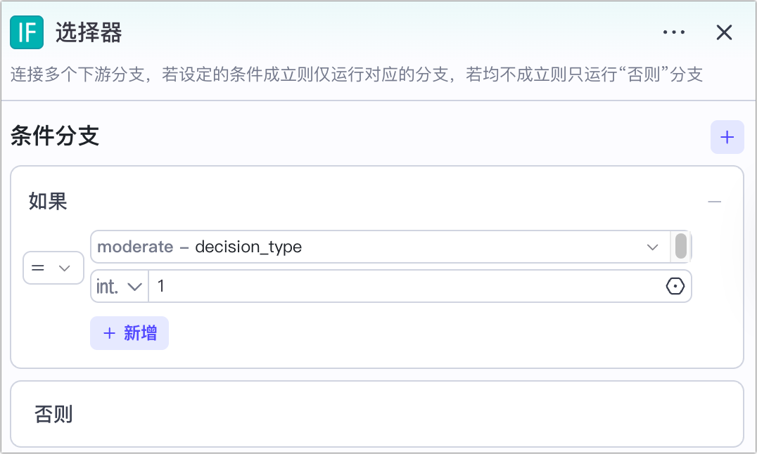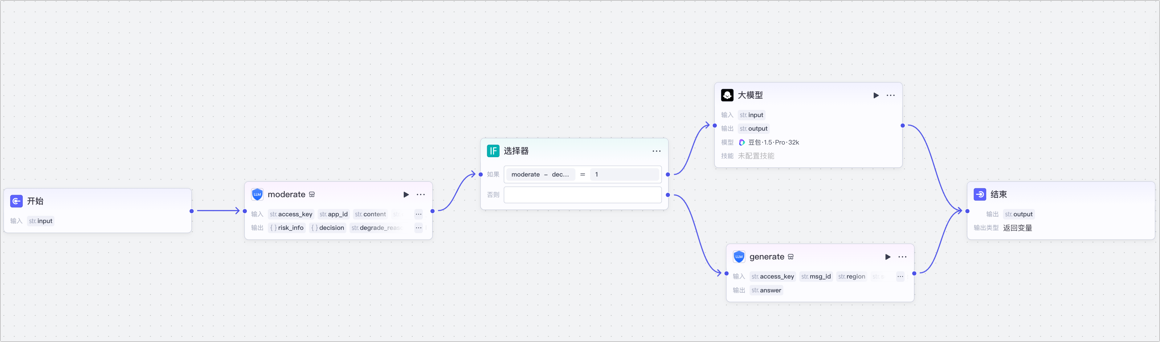 当且仅当送检内容不存在风险,即被 moderate 插件判定为放行(对应decision_type = 1)时,直接将用户提示词作为大模型的输入,否则调用 generate 插件生成代答结果。
