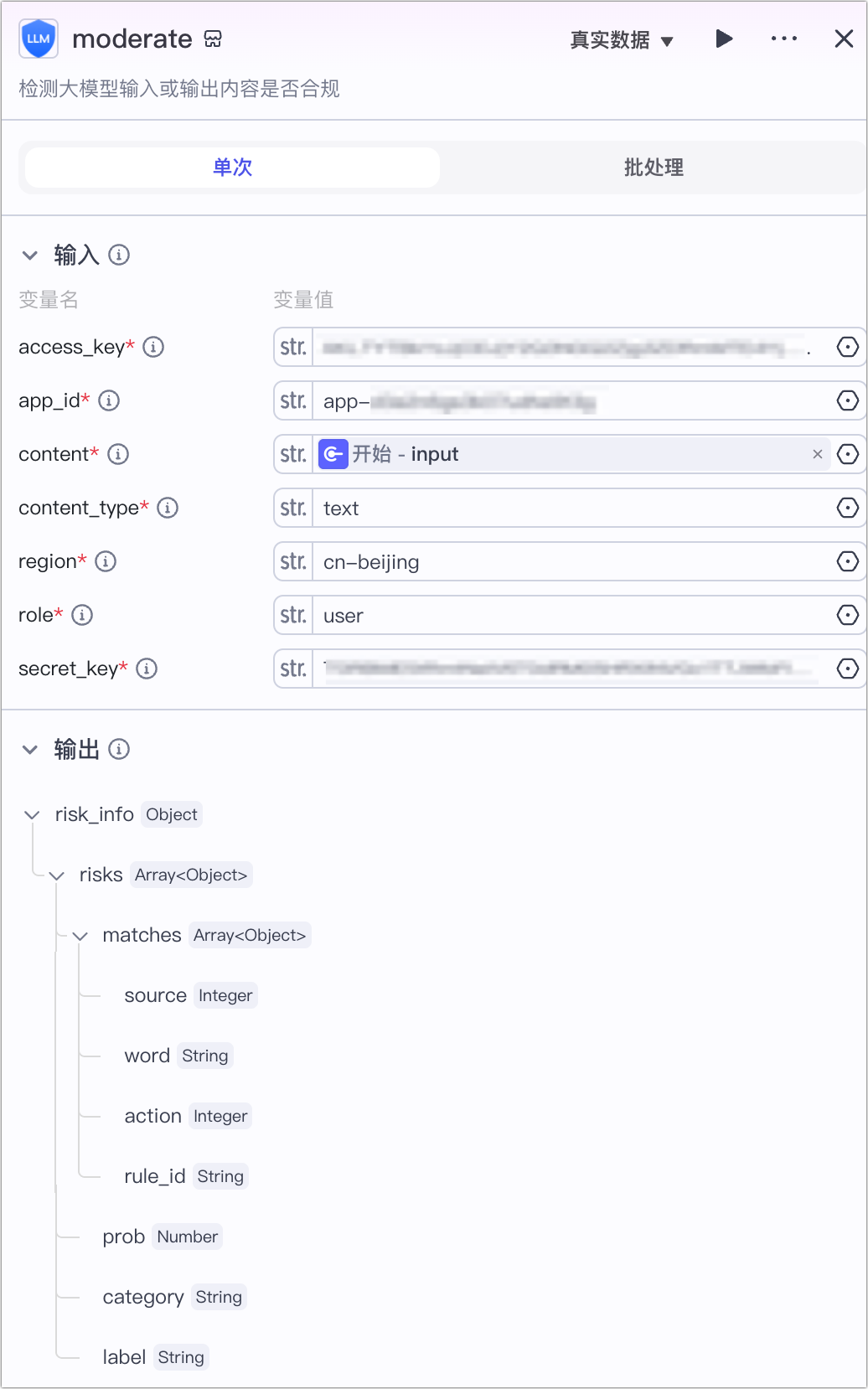 content | 今天天气怎么样。 | 需要检测的内容。该工作流中直接配置为开始节点的 Input,则每次用户输入都将自动传入内容。 |
