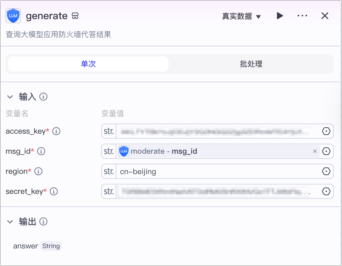 msg_id | 19de789baf324b4480e25c9616aa**** | 消息唯一标识符。该工作流中直接配置为 moderate 插件输出的 msg_id,可自动传入并生成代答结果。 |