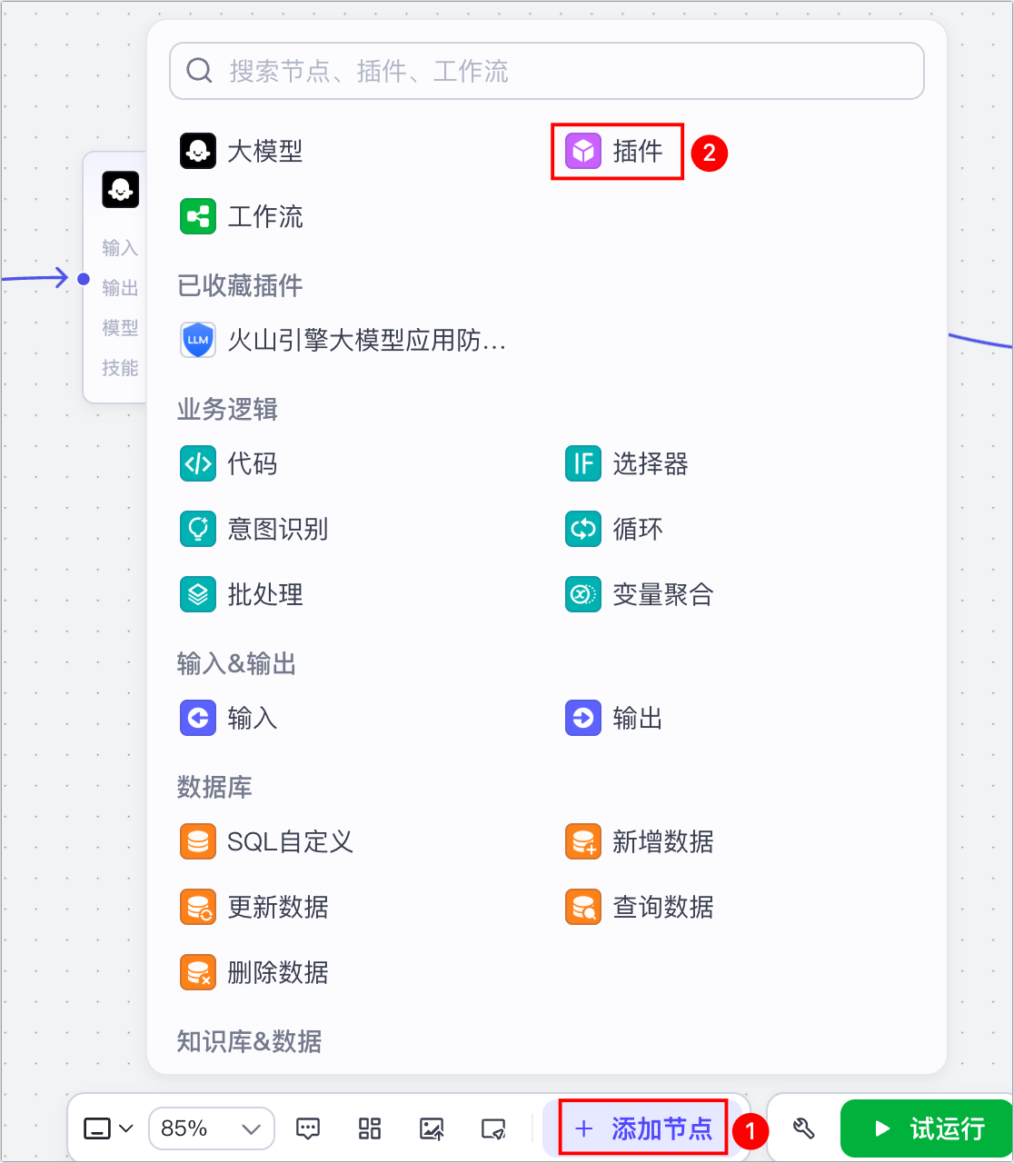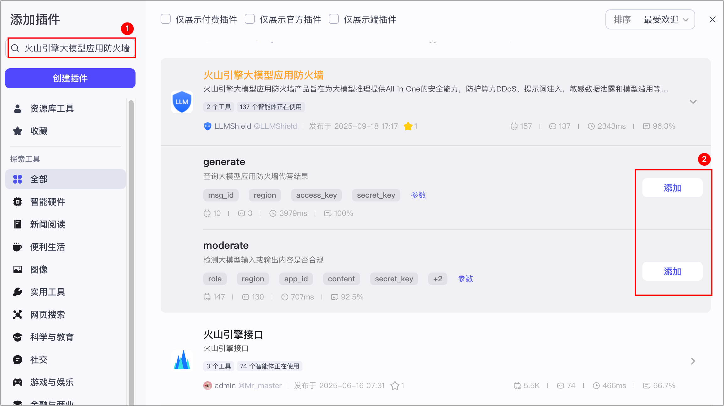 搜索火山引擎大模型应用防火墙,将两个插件添加至当前工作流中。