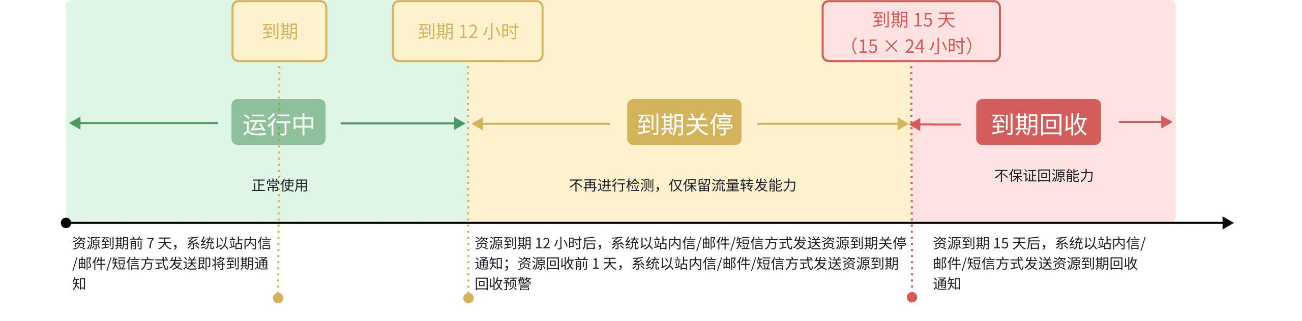 到期 12 小时后 ~ 15 天内 | 到期关停 | 防护功能将停止,但数据转发能力会保留。 |