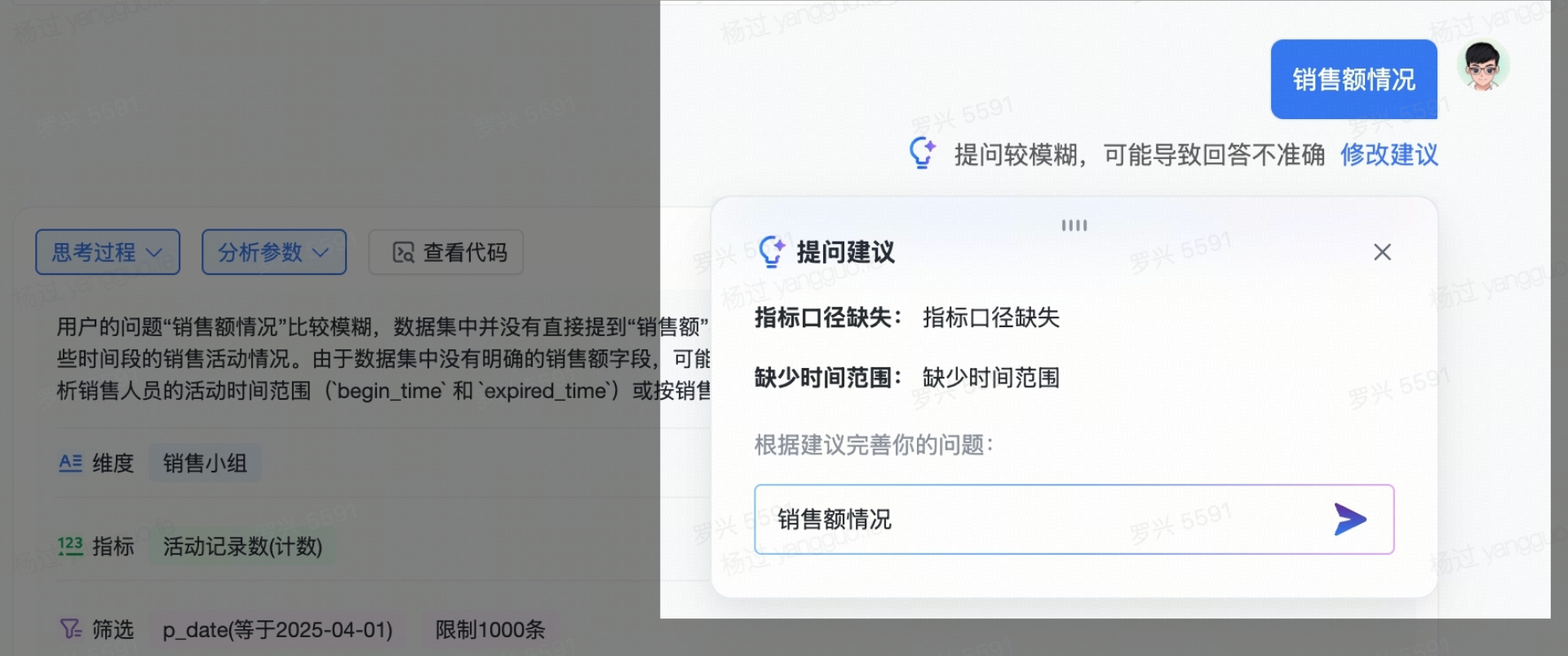 支持用户点击「分析参数」查看抽取数据的具体信息,包括维度、指标和筛选条件,用户可据此判断给出数据是否符合查询要求。