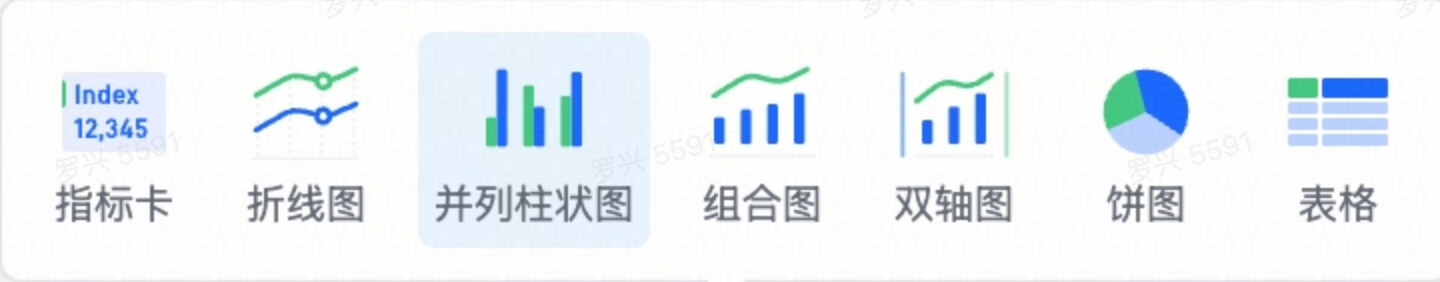 回答:目前支持以下7种图表形式:表格、趋势(折线)图、柱状图、指标卡、饼图、双轴图、组合图。