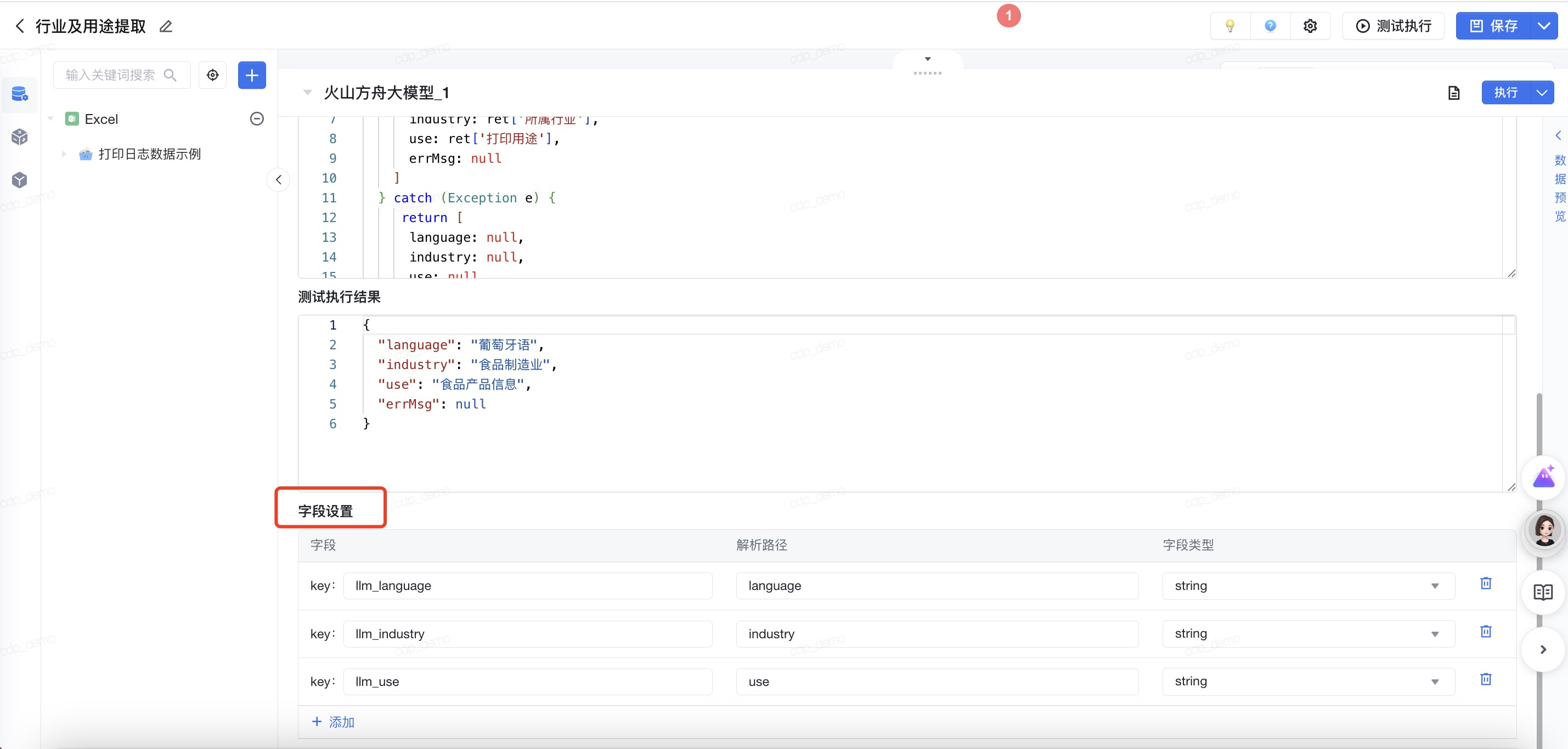 点击页面下方的「测试执行」,系统将根据用户输入的字段名称,进行标签提取并给出示例结果。