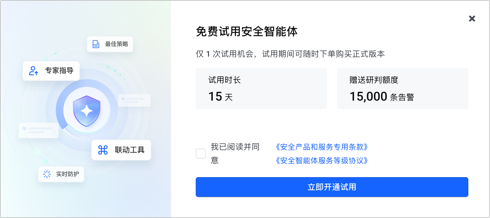 安全运营智能体目前提供为期 15 天的免费试用,让您亲身体验其强大的自动化安全运营能力。本指南将引导您完成从开通到初步使用的全过程。