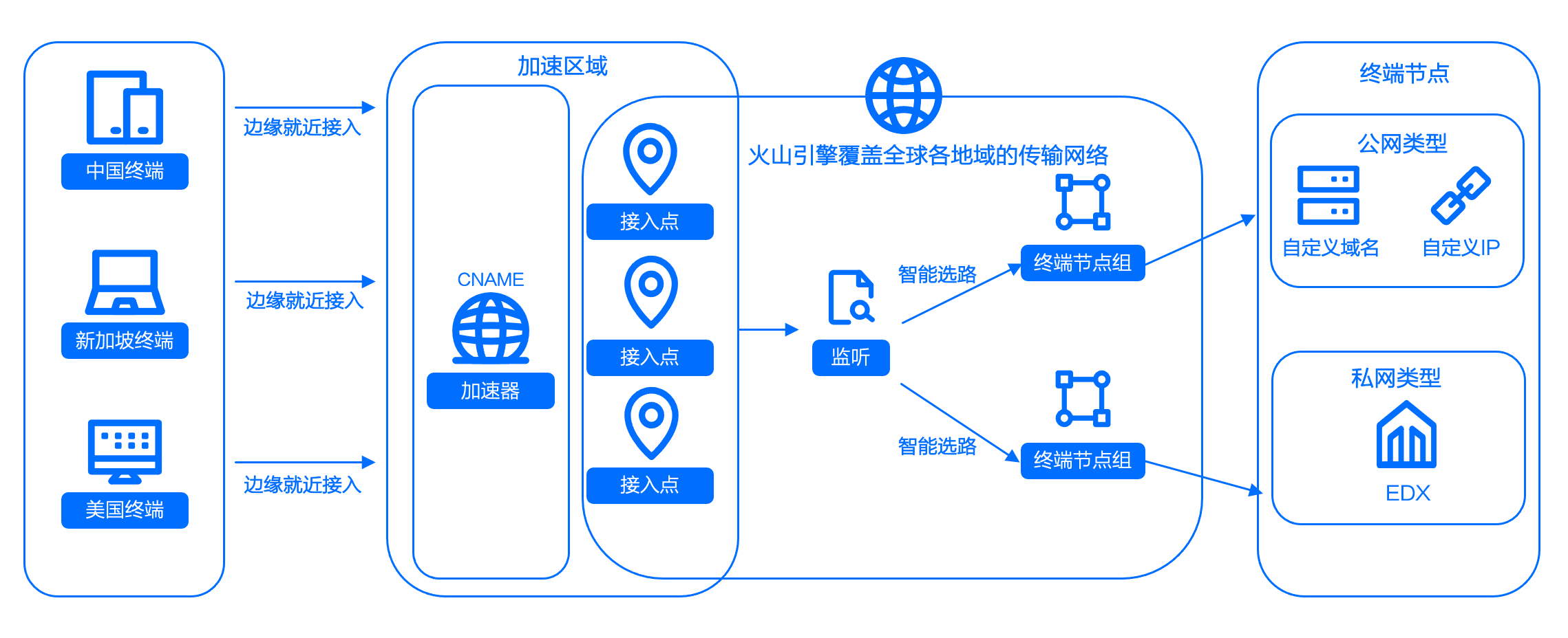 www.test.com时,将此域名解析到CNAME:www.test.com.c.vedcdnlb.com。www.test.com.c.vedcdnlb.com解析。标准型加速器提供了 IP 和 CNAME 两种接入方式。智能全球加速让用户就近接入火山引擎提供的加速网络,提升了客户端到终端节点的访问速度。标准型加速器的组成元素如下图所示。
