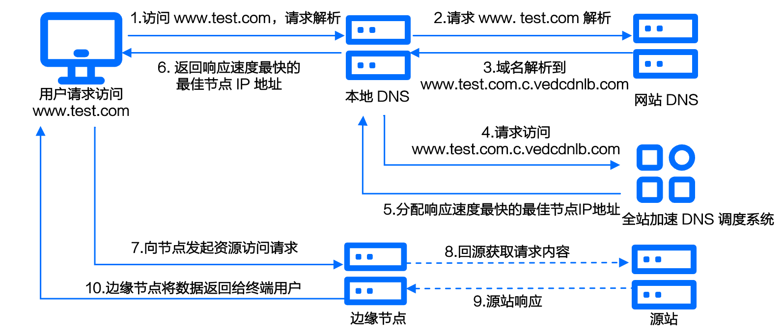 在您的业务域名www.test.com接入智能全球加速服务后,在您的用户发起 HTTP 请求时,智能全球加速加快客户端请求内容分发的流程如下: