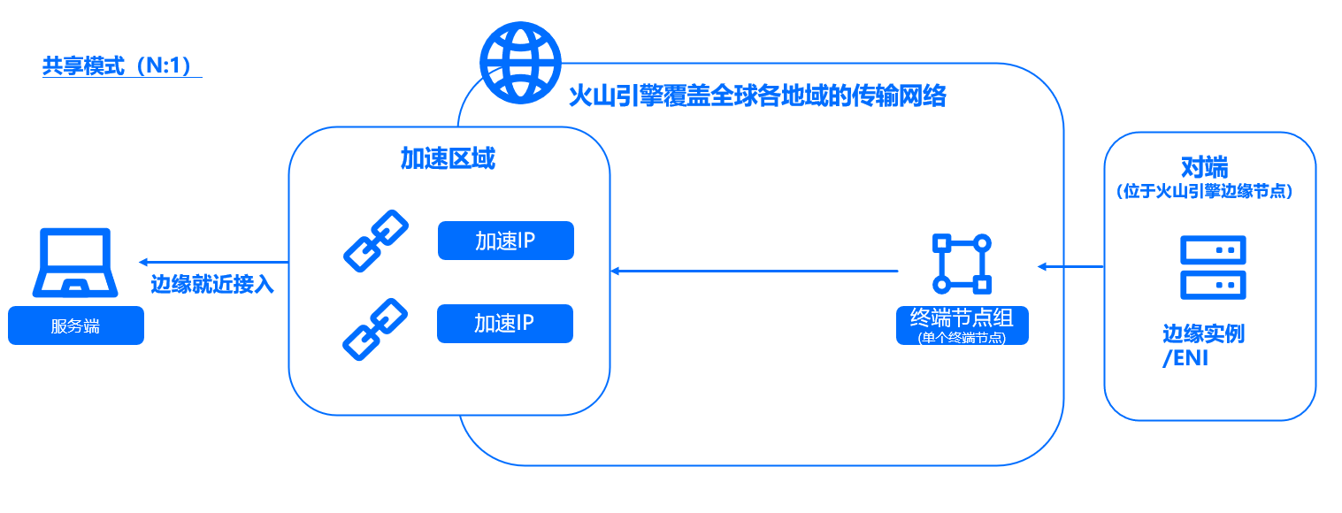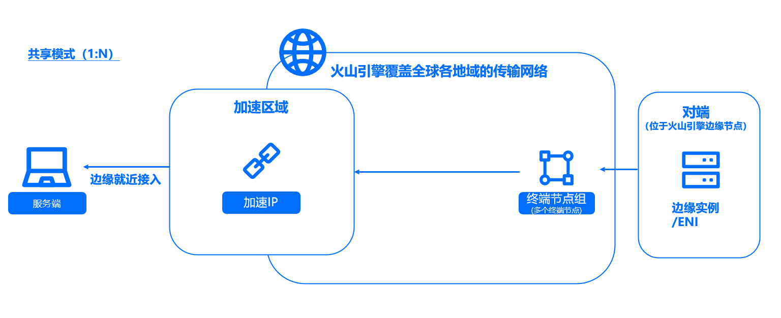 | 共享模式 | 位于加速区域内的服务器端通过加速 IP 接入加速网络,位于火山引擎边缘计算节点的一个或多个边缘实例或者 ENI 网卡向服务器端主动发起连接。在该模式下,位于加速区域的服务器端无法主动向对端发起连接请求。 |