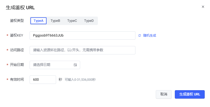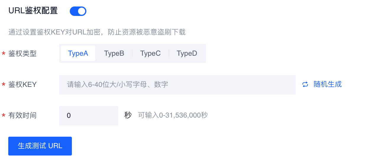 - 点击 生成测试URL,输入并确认:鉴权类型、鉴权 KEY 、访问路径、开始日期、有效时间。