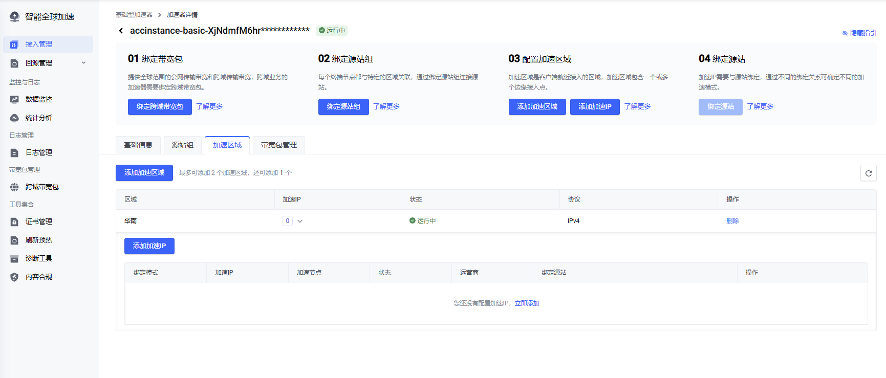 对于基础型加速器,在您成功添加加速区域后,需要在该加速区域下添加加速 IP,并同时把加速 IP 绑定到源站。一个加速区域下,最多可以添加 5 个加速 IP。