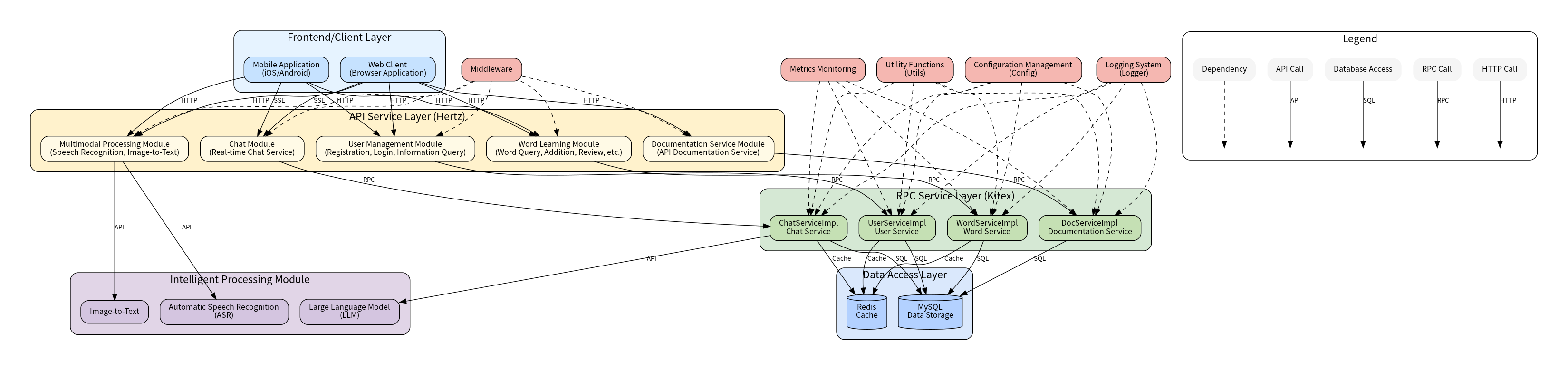 “积流成江” 是一个基于 Hertz 和 Kitex 框架构建的单词学习与语言处理微服务系统。该系统提供了从 API 服务到 RPC 实现的完整解决方案, 包含用户认证、单词管理、复习进度跟踪、实时聊天、语音识别和图像转文本等核心功能模块。