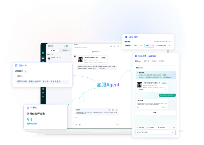通过API无缝集成到现有工作台,在原有客服框架实现AI升级,帮助客服提升服务效率和质量,并完成质检评价等业务联动
