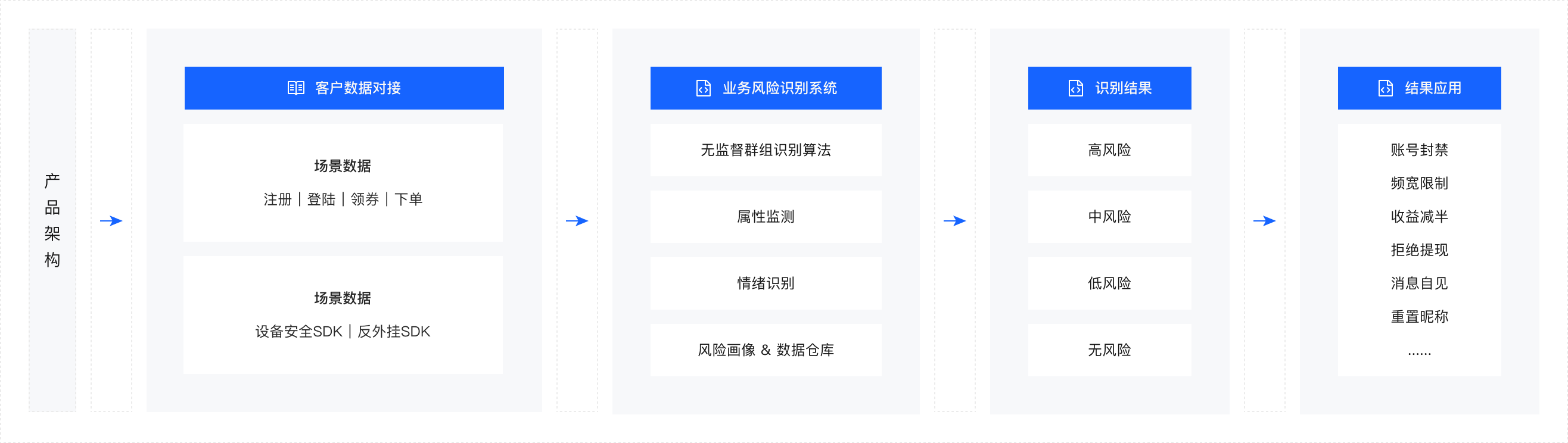 识别批量注册、撞库登录、囤号养号、账号交易等风险,避免黑产对业务生态造成冲击。