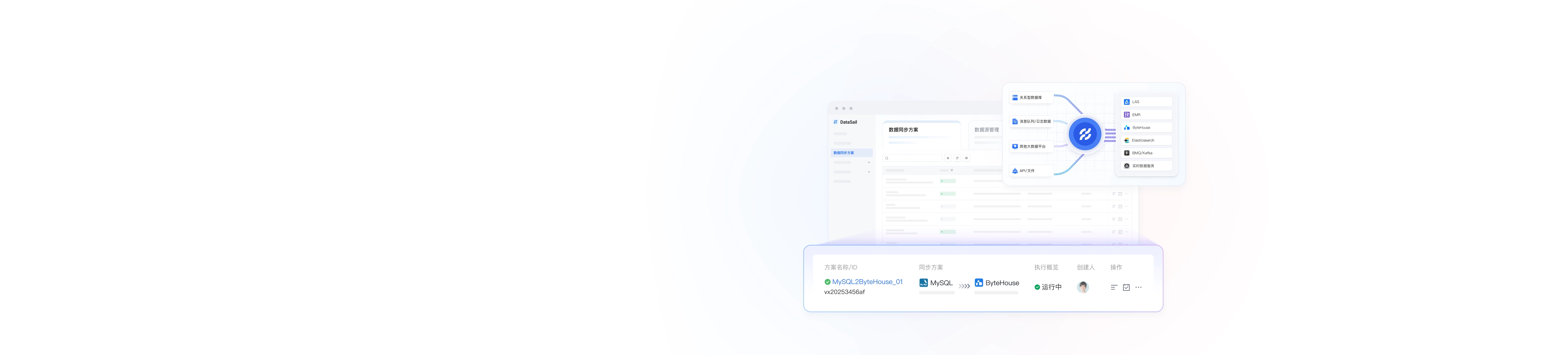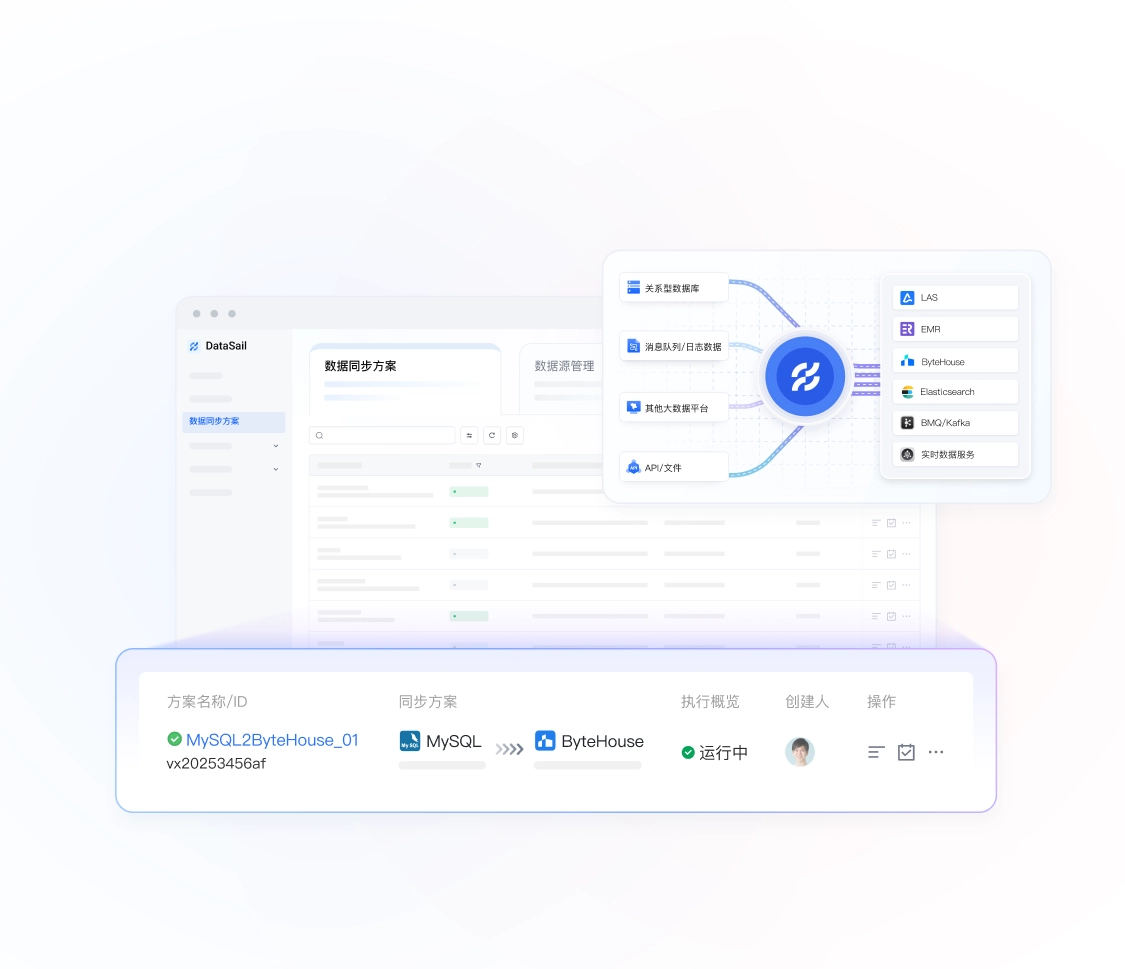 DataSail 依托抖音集团全域数据处理能力,提供数据实时接收、处理、分发全流程解决方案。支持四十余种异构数据源,以增量、全量、全增量等形式,在复杂网络环境下实现高速稳定的批式、流式同步。