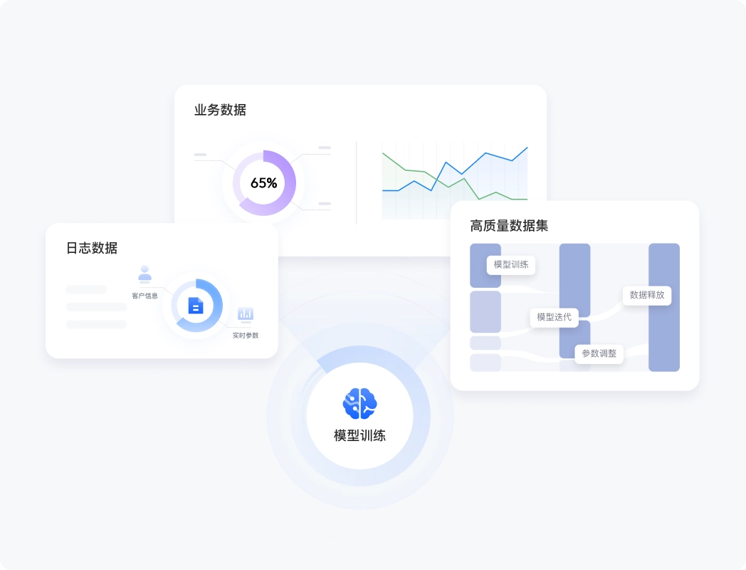 DataSail帮助大模型企业融合日志、第三方、业务、行为等多源异构数据,实时高效整合数据,为模型训练与迭代提供高质量数据集,应对业务快速发展,加速模型训练。