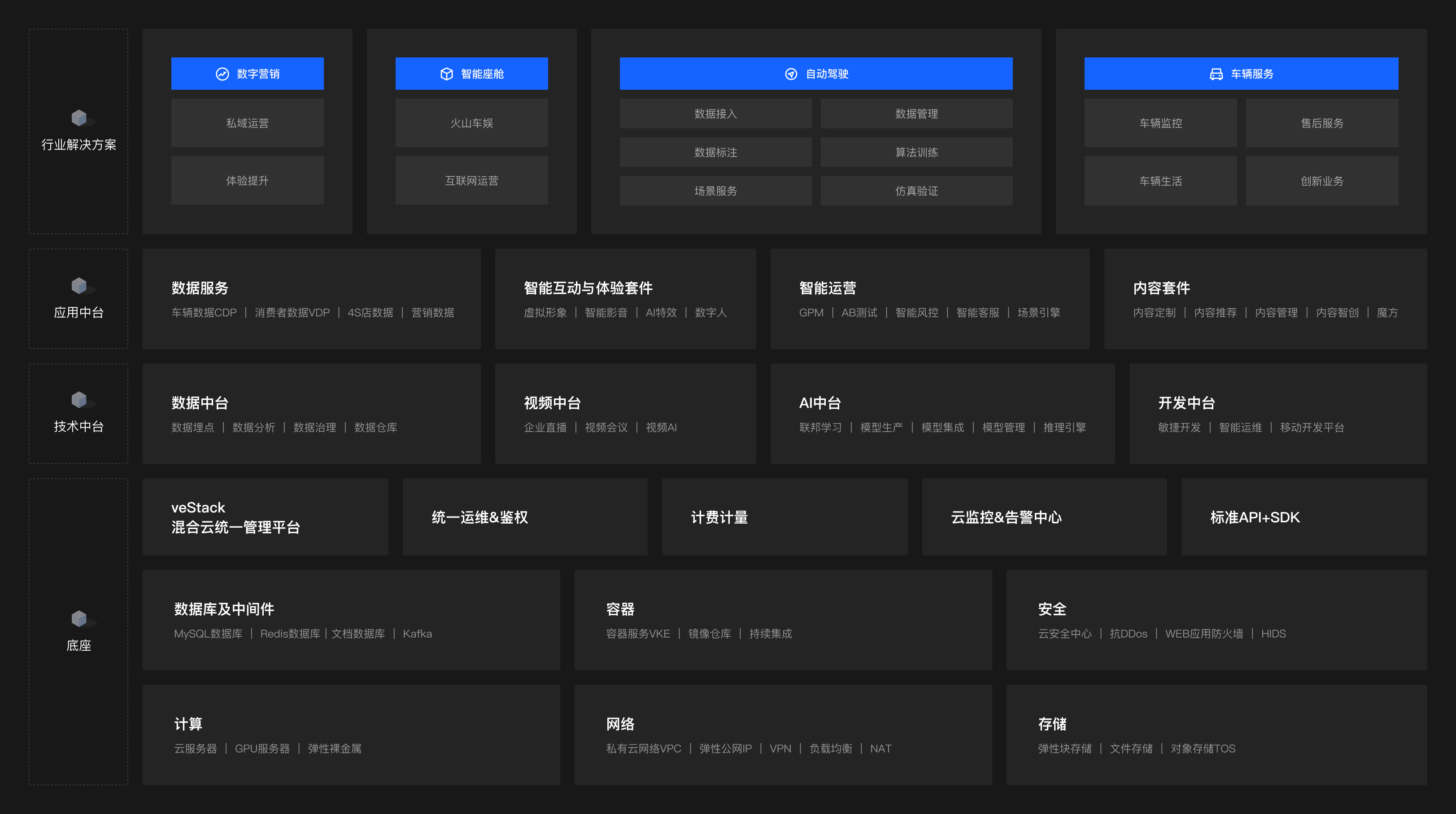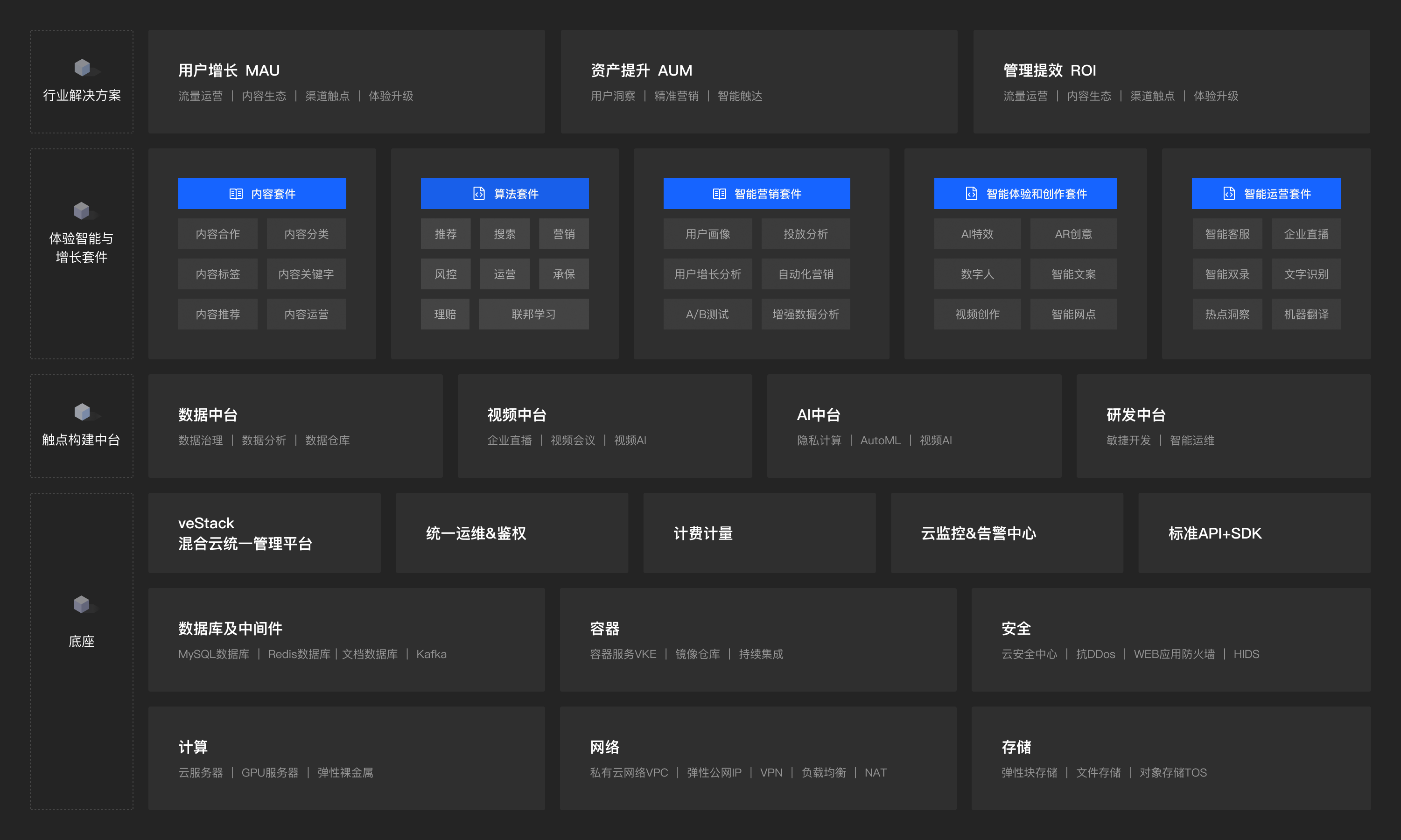 提供块存储、对象存储TOS、NAS文件存储等存储服务,支持企业用户存放海量结构化数据和非结构化数据