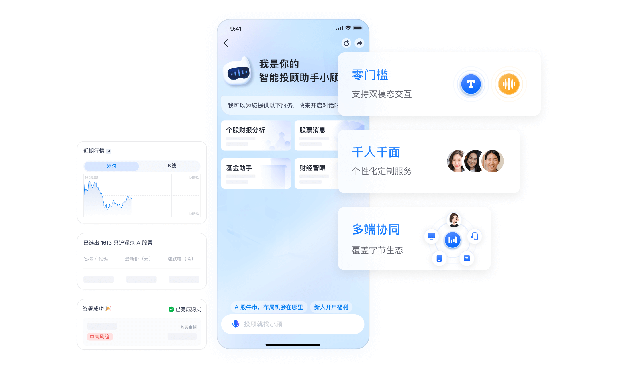 以手机客户端为载体,使用AI大模型技术,为客户提供智能投顾、智能交易、智能服务、智能资讯等场景的交互式体验和金融服务的AI-native平台